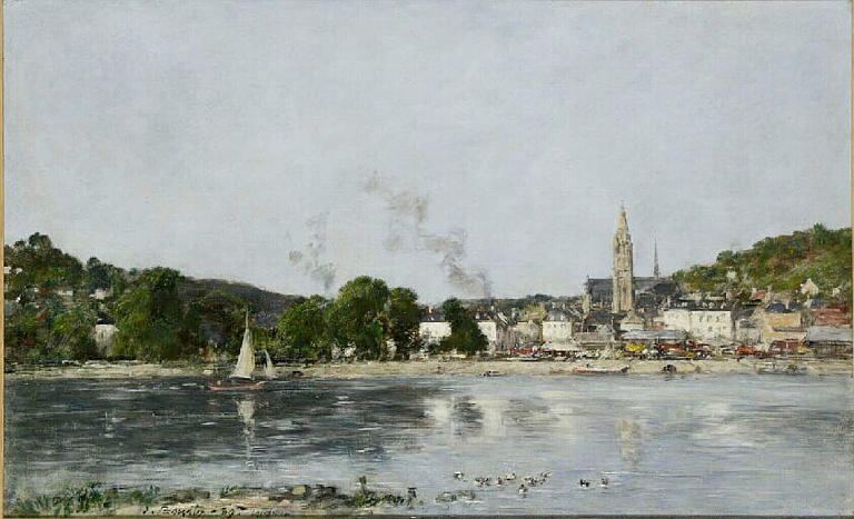 signé et daté, en bas à gauche : BOUDIN.89.CAUDEBEC ; étiquette, au dos : + International Art Transport - Eugène Boudin 'La Seine à Caudebec en Caux' - 21 - Musée des Beaux-Arts André Malraux. + N° 12 La Seine Caudebec en Caux.
