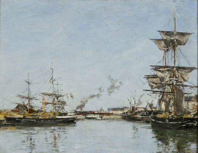 signature, en bas à droite, BOUDIN ; étiquette, au dos, + Pusey entreprise générale d'emballages garde meubles déménagements 23, 25, 27, rue des Petites Ecuries Paris. + LP ART B.P. 70 45, rue de Chabrol 75462 Paris cedex 10 - exposition 'Boudin et les peintres à Honfleur' n° 31 Le bassin de Deauville, B 17 - musée des Beaux-Arts André Malraux 01609004 AC. + LP ART - dossier de Boudin à Dufy titre 0013 Le bassin de Deauville B 17 musée des Beaux-Arts Le Havre. + N° 17Marine Le bassin de Deauville. + A. Guinchard & F. Fourniret emballeur 76, rue Blanche & 11, rue Lepic Paris. Exposition de 'Le Havre' de M. Boudin. ; tampon, au dos, illisible.
