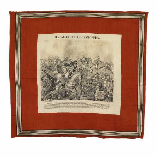 inscription concernant l'exécutant : Signature du graveur en bas à droite : A. Buquet ; inscription concernant l'exécutant : Signature de l'imprimeur en bas à gauche : Fabrique de E. Renault à Rouen ; titre : Titre du mouchoir en haut : bataille de Reichshoffen