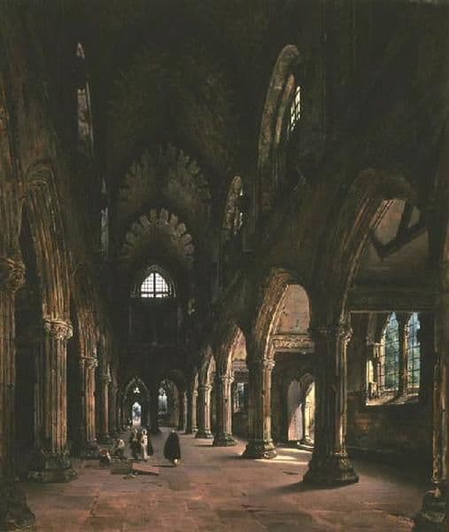 Tableau exposé à Paris au Salon de 1824 sous le titre : Esquisse de l'intérieur de l'abbaye de Rosslyn à sept miles d'Edimbourg. Contemporain de la grande version présentée dans le cadre du diorama de la rue Samson à Paris, puis, en Grande Bretagne.
