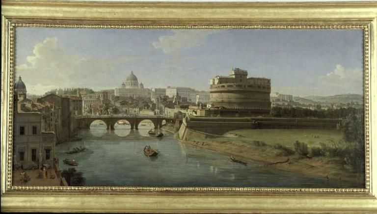 Le Tibre, le château Saint-Ange, Saint-Pierre, le pont Saint-Ange : un des plus jolis panoramas de Rome. C'est une vision contemporaine et vivante de la ville, hors des limites de ses restes antiques. La véracité topographique et la minutie des détails n'otent rien à la poésie du site rendu avec la richesse de ses couleurs et la limpidité de son ciel; vue urbaine, collines, embarcation, personnage.