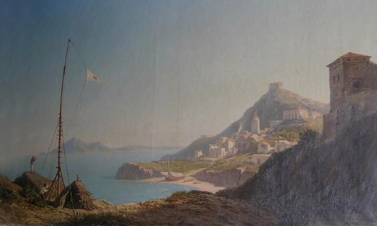 paysage (golfe, ville, tour fortifiée, Méditerranée) ; scène (personnage, objet de signalisation : drapeau)