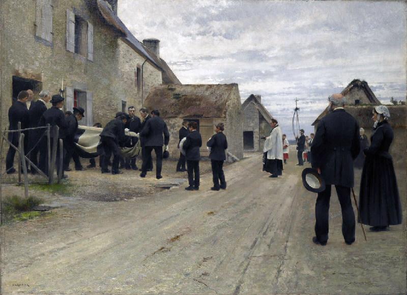 scène (Manche d, foule, abbé, enterrement, village, rue, chaumière)