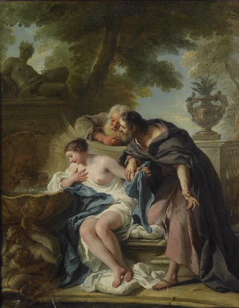 scène biblique (Suzanne, vieillard, nudité, fontaine, statue, balustrade, vase de jardin, époque Louis XV)