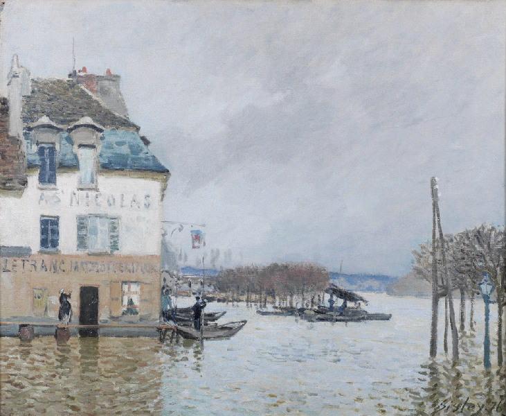 Une vue de Port-Marly pendant les crues de mars 1876. L'artiste s'est installé au coin de la rue Jean-Jaurès et de la rue de Paris, face à la boutique d'un marchand de vin reconnaissable à l'inscription en lettres bleues : 'A St NICOLAS', bien lisible sur le fond blanc du premier étage, et difficilement déchiffrable à l'étage inférieur, sur fond ocre: 'LEFRANC.....' La composition, fermée à gauche par la bâtisse devant laquelle stationnent des barques, s'ouvre sur la Seine à droite où un poteau électrique et de frêles troncs d'arbres semblent impuissants à contenir la montée de l' eau rendue plus inquiétante encore par la menace voilée d'un ciel épais, lourd de pluies à venir. Le contraste obtenu par le jeu des couleur est renforcé par l'intensité des reflets du pan de mur ocre dans l'eau verdâtre à gauche, repris par droite dans les même tons par le petit bouquet rond des châtaigniers. Les pures vibrations blanches de la lumière solaire animent la masse centrale d'un miroitement dont l'éclat paraît insoutenable. Seules quelques menues silhouettes animent la composition dont se dégage paradoxalement une grande sérénité.