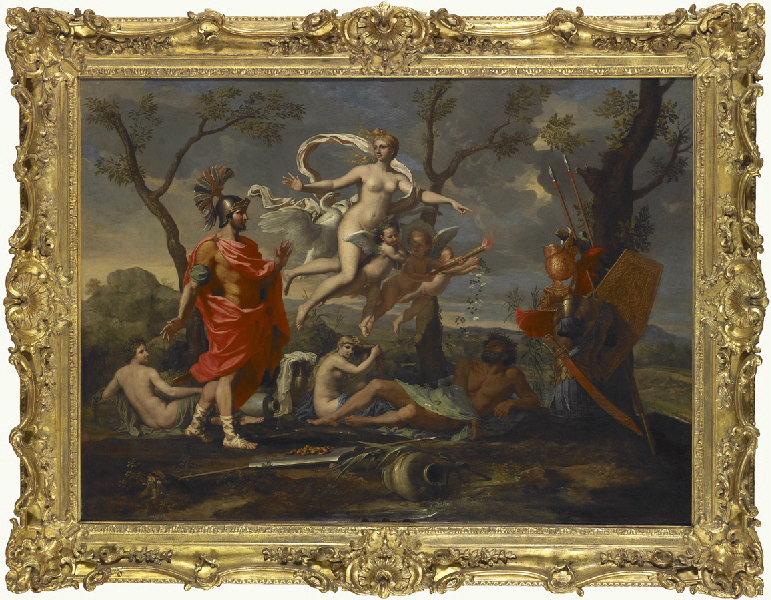 scène mythologique (Vénus, Enée, cuirasse, bouclier, casque, lance, épée, putto, cygne, femme : nudité) ; fond de paysage