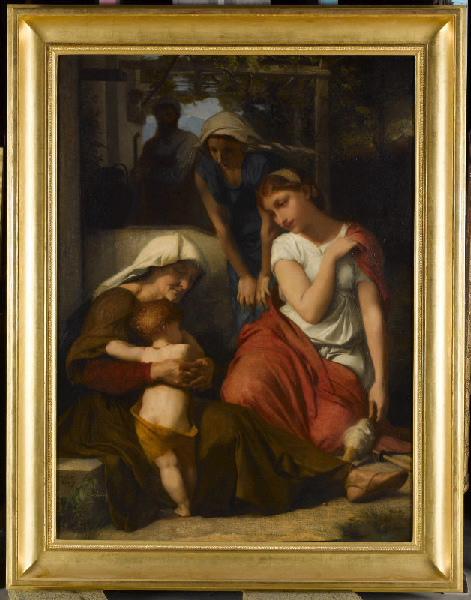 scène biblique (Ruth, Noémi, enfant, étreinte, rouet, femme)