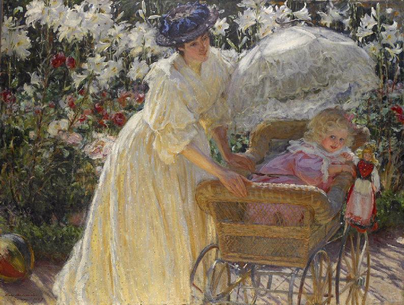 scène (femme, enfant, amour maternel, poupée, berceau, ombrelle, jardin : fleur : lys)