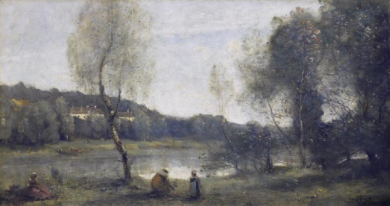 paysage (étang, bouleau, maison, ville, Ville-d'Avray) ; figure (fillette, fleur, cueillette)