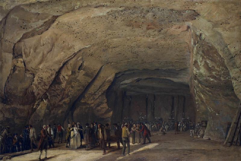 scène (visite, espace industriel, entrepôt, sel, personnage, ouvrier, portage, Dieppedalle-Croisset) ; paysage (caverne)