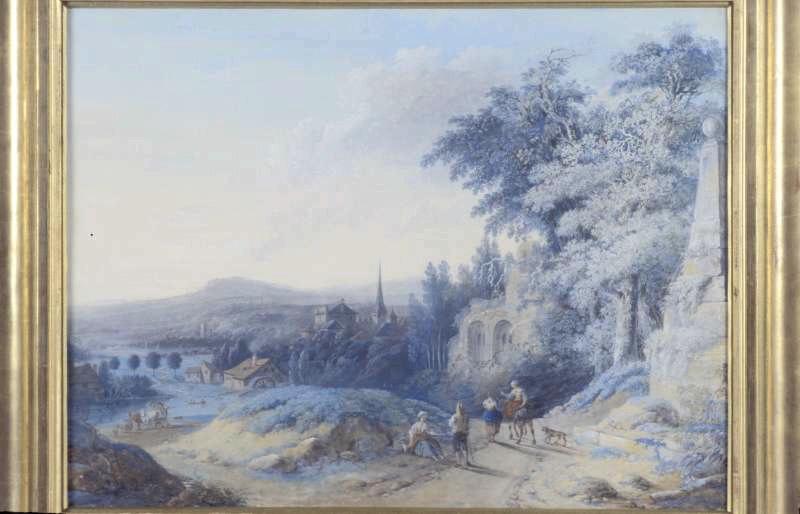 paysage (village, maison, ruines, personnage, moulin, âne, église, chien)