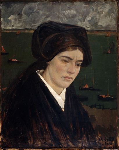 Son visage, tourné vers la droite, s'enlève sur un fond de mer, parsemé de barques et un lambeau de ciel gris. Une coiffe de deuil recouvre les bandeaux de ses cheveux châtains et un châle noir sous lequel dépasse , au col, une lingerie blanche, lui enveloppe les épaules ; Huile sur carton
