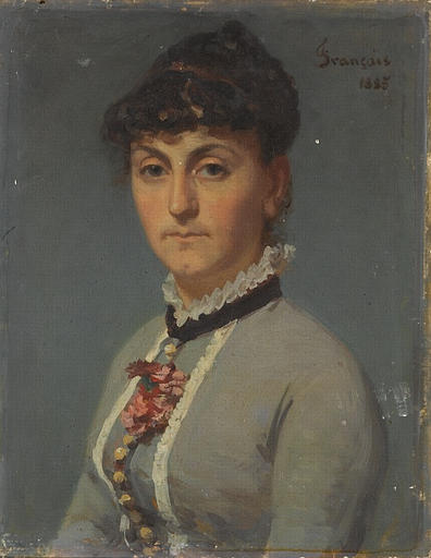 Tête nue, vêtue d'un corsage gris orné d'un bouquet de fleurs ; un ruban noir autour du cou ; Huile sur bois