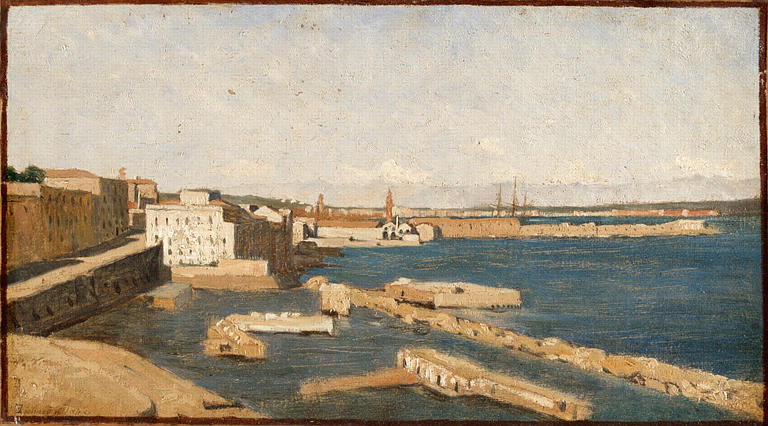 A droite, la mer et la ligne des môles ; à gauche, suite de maisons bordant un quai ; Huile sur toile