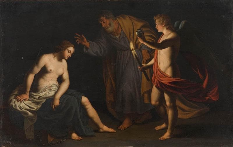 Saint Pierre, conduit par un ange, visite sainte Agathe dans sa prison