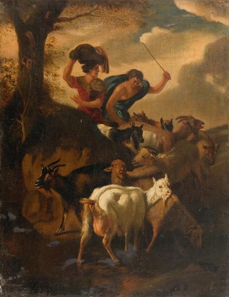 Paysage animé : troupeau de chèvres et de moutons descendant un coteau