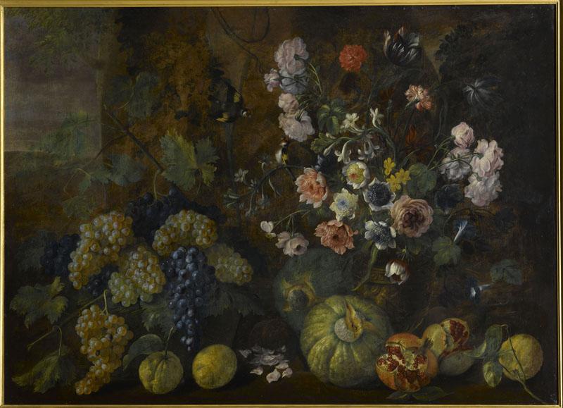 nature morte (vase, fleur : rose, oeillet, tulipe, fruit : raisin, melon, citron, grenade fruit)