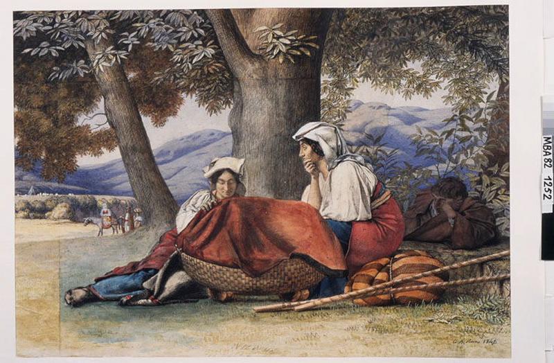scène (femme, assis, repos, berceau, voyageur : sac, homme, couché, accoudé, bâton : la marche, costume traditionnel : Italien) ; fond de paysage (colline, tronc, feuillu, transport à dos d'animal, âne, femme : portage, chemin, Italie)