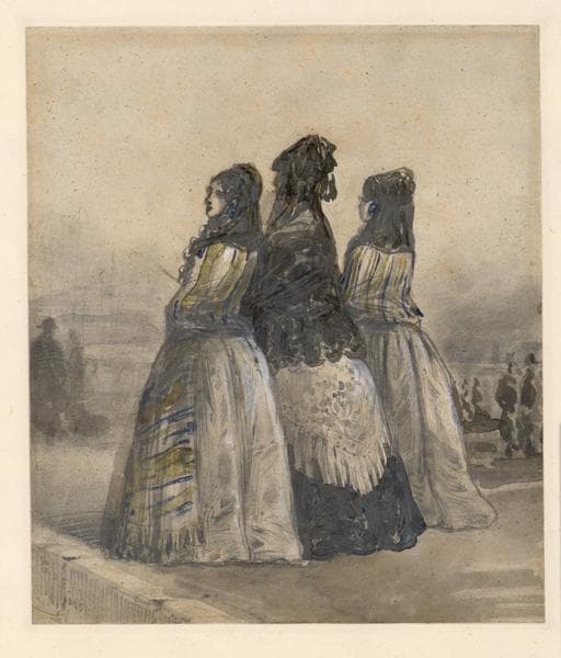 POP | Plateforme ouverte du patrimoineTrois dames espagnoles en promenade ; Deux jeunes filles, accompagnées de leur mère ; Deux jeunes filles, accompagnées de leur mère, s'en vont à la promenade. Elles portent des mantilles et des écharpes (autre titre)