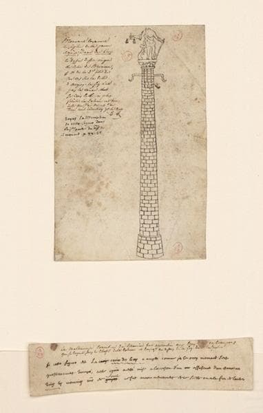 texte, A gauche : Monument consacrant / le suplice [sic] de la pauvre / Agnès, Dame des Lices. / Ce dessin diffère un peu / de celui de Bruneau / [?] 17 de la 3e p[ar]tie de / son m[anu]s[crit] sur la ville / d'Angers. la fig[ure] n'est / pas la même. / Je crois celle-ci plus / fidèle. La colonne est bien / celle que j'ai vu [sic] et j'en / tire une induction p[ou]r le texte. / E. M [?] [autre écriture] voyez la description / de cette figure dans / la 1ère partie du m[anu]s[crit] de / cl. ménard p. 72.5e ; texte : Sur le deuxième feuillet : La malheureuse concubine du chanoine fut accrochée aux crocs ou crampons / qui se voyent sous le chapit[eau] de la colonne et conséq[uemmen]t au dessous de la fig[ure] de la Justice [autre écriture] si cette figure est la croix des lices à angers comme je le croy ménard s'est / grossièrement trompé, ceste croix a esté mise à l'occasion d'un assasinat [sic] d'un chanoine / voies les mémoires m[anu]s[crits] de Louvet. Ce fut au commencement de ce siècle ou à la fin de l'autre