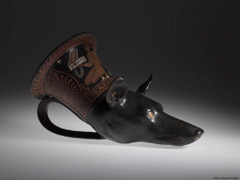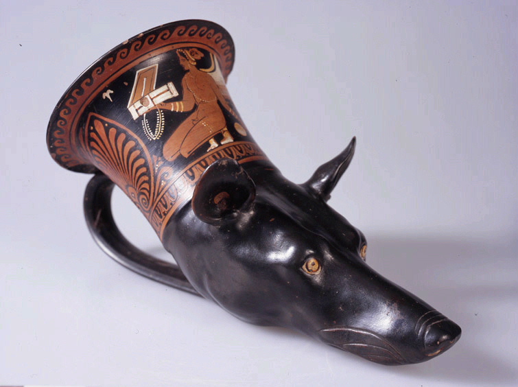 Rython en terre cuite à figures rouges, vernis noirs, rehauts blancs, moulé. ; La tête du lévrier, finement rendue, est posée au sol dans l'attitude réaliste d'un chien soumis à son maître. Le col du rhyton est orné en figures rouges d'un éros hermaphrodite ailé, accroupi sur ses talons, qui porte un coffret entrouvert et une couronne de perles, tandis que de la main gauche, tendue vers le sol, il tient un miroir.