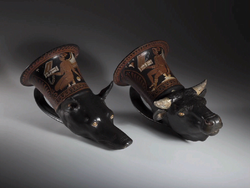 Rhyton à tête de lévrier à l'Eros tenant un coffret ; Tête de lévrier avec représentation d'Eros