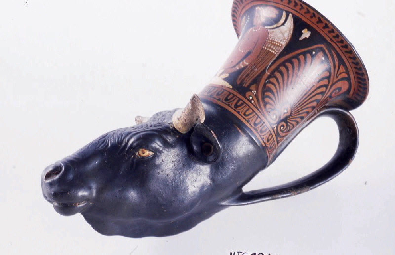 Rhyton à tête de taureau à l'Eros tenant un coffret ; Rhyton à tête de bouvillon (Titre de la notice de Catherine Lesseur, 2005-2006) ; Tête de taureau avec représentation d'Eros (Titre de la notice de Catherine Lesseur, 2005-2006)