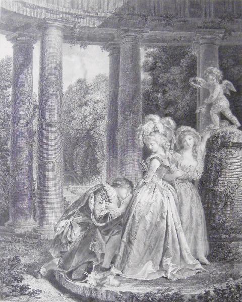 Sous un temple, dont on voit les colonnades en arrière-plan, un homme, un genou à terre, baise la main d'une femme noble (Marie-Antoinette ?). Une seconde femme tient le bras de cette dernière et touche une statue d'un petit amour.
