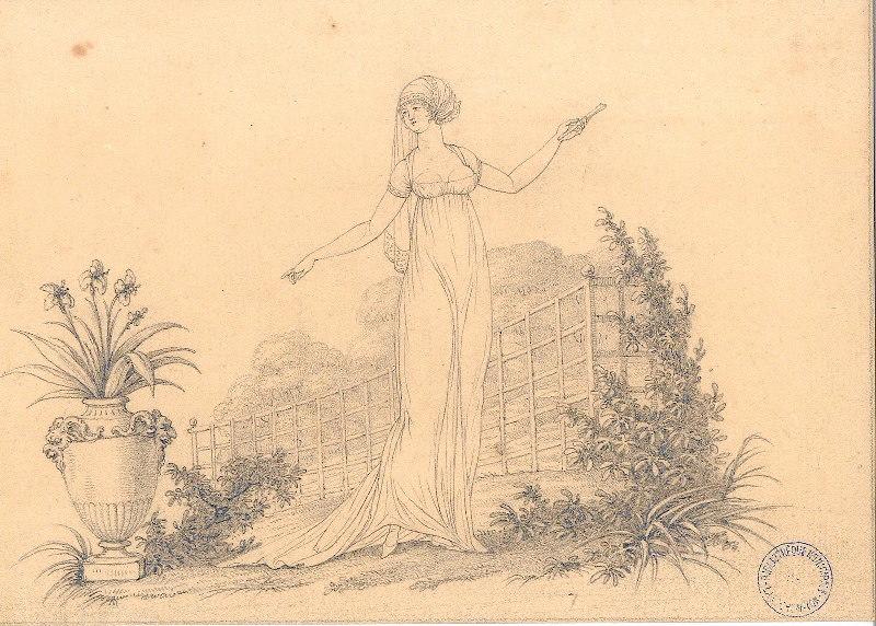 portrait (femme, en pied, vêtement : mode : Consulat, Ier Empire, éventail, jardin, plante)