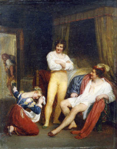 scène (abandon, fidélité, jalousie, prince, serviteur, prostituée, homme, femme, sourire)