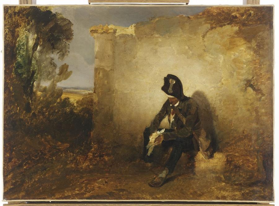 Scène montrant un garde-chasse, vêtu d'un costume hérité de la période napoléonienne encore proche, assis devant un mur en pierres blanches en ruines, dévoilant à l'arrière-plan à gauche un paysage. Oeuvre de jeunesse de l'artiste, par son sujet lié au thème de la chasse, par son style très libre, proche de l'aquarelle, ce rare tableau est considéré comme une oeuvre clé de cette période, où Decamps simplifie son motif principal, lui donnant ici une monumentalité impressionnante dans une lumière dorée. La figure se détache sur un mur blanc en harmonie avec un ciel d'orage à la Georges Michel, qui contraste avec l'unique arbre, vert vif. La mise en place du fond blanc lumineux annonce le parti qu'en fera l'artiste par la suite dans la plupart de ses scènes de genre, orientales ou non, ou ses sujets ruraux. Outre ses qualités picturales, cette toile, bien documentée, offre un intérêt historique pour la carrière de l'artiste et le patrimoine de l'Oise. L'inscription manuscrite au revers qui précise le sujet et les circonstances du tableau, indique qu'il a été exécuté à Hénonville dans l'Oise, chez le fameux baron d'Ivry, ardent zélateur de l'Ecole du paysage de 1830 et protecteur de Georges Michel, comme de Decamps à ses débuts. La famille de Jean-Baptiste-Maurice Roslin d'Ivry était en effet, depuis deux générations de fermiers généraux, propriétaires du château à Hénonville. Lui-même, officier de louveterie du département de l'Oise, veillait aux destinées de la commune depuis 1813.