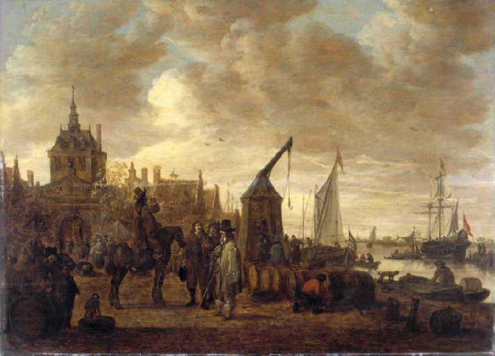 scène (Dordrecht, port, quai, marchandises, tonneau, vin, cavalier, bateau)