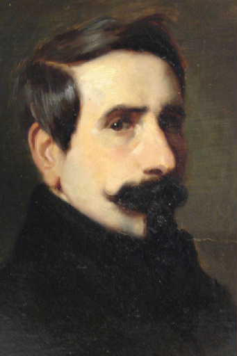 Portrait de 3/4 face du peintre Jules Dehaussy portant moustache et barbe de style 'Napoléon III'. Jules Dehaussy était le frère et l'élève d'Auguste Dehaussy, auteur du présent portrait.