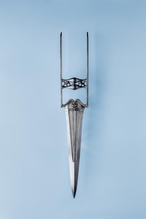 profondes gouttières de part et d'autre d'une arête centrale prenant la forme d'un long cyprès, agrémenté à sa base de deux guirlandes perlées et d'une fleur. La base de la lame est ciselée avec un motif festonné en arcades, ornées de points ciselés. La jonction poignée-lame est en forme d’accolade.