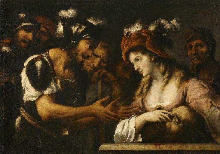 scène biblique (Judith, coiffe, bijou, tête : Holopherne, femme, chapeau, tête, homme, mort, soldat, armure, serviteur)