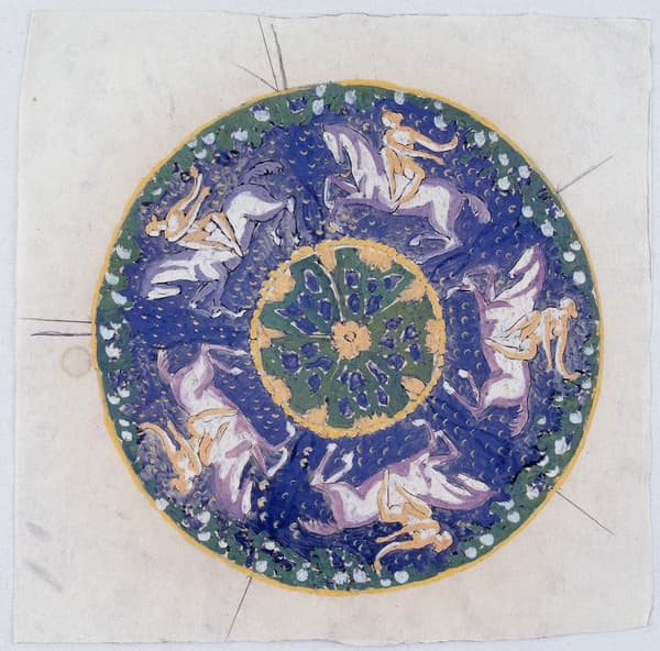 Projet d'assiette circulaire à décor jaune, bleu, vert, violet