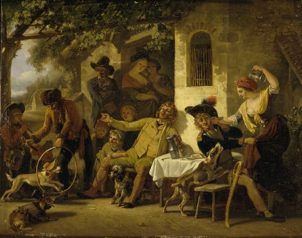 Saltimbanques devant une auberge ; Une scène de foire devant un cabaret de village Enfants faisant danser un chien (Ancien titre)