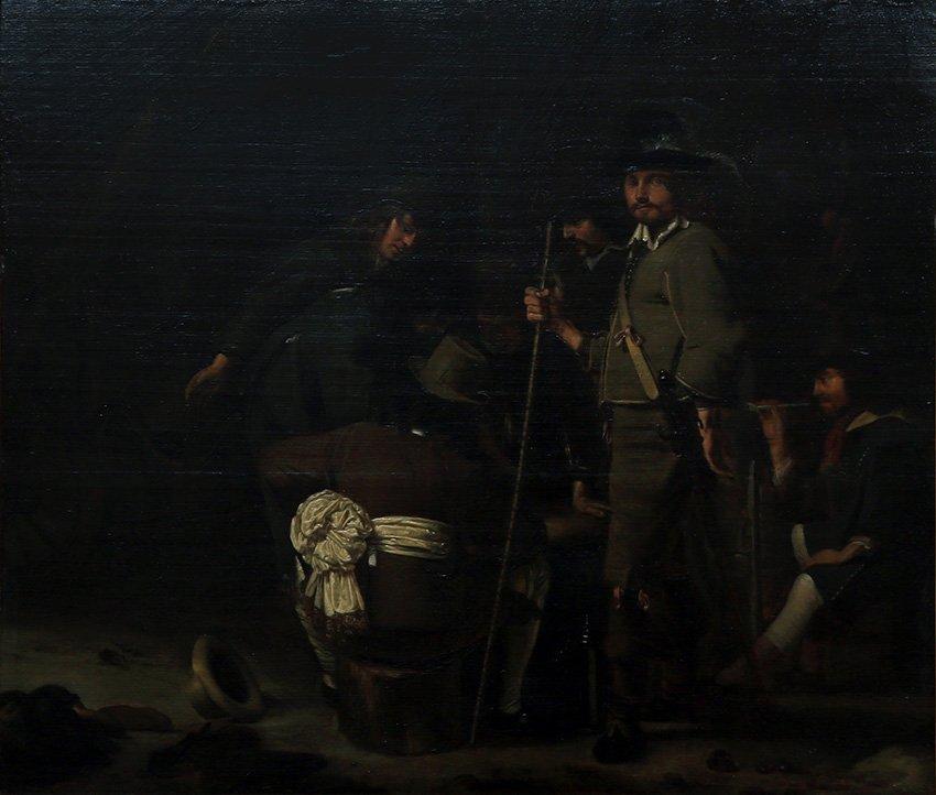 Malgré la signature en bas au centre : L. C. Duck (?) fecit, l'attribution au peintre Duck a été remise en question dès 1963 par Gerson. L'oeuvre est dès lors rendue à Simon Kick ; en rapport avec : Corps de garde