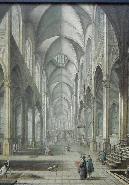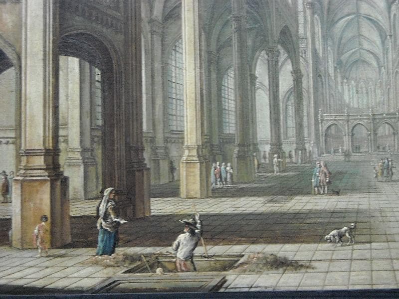 L'attribution actuelle de ce tableau donné auparavant à l'école française du 17e siècle est due à Monsieur J. Foucart. La peinture d'intérieurs d'églises apparut en Flandres vers 1570 avec Steenwick l'Ancien. Ce genre nouveau représente un aspect particulier de la peinture d'architectures, qui prend ses racines dans les réalisations perspectives imaginaires de Hans Vredeman de Vries (1527 - 1606). A côté des vues de villes, d'extérieurs de bâtiments, les intérieurs d'églises sont un type spécifique qui se développa à Anvers, Delft et Haarlem tout au long du 17e siècle. De nombreux peintres, flamands puis hollandais, se spécialisèrent dans ce genre, dont la vogue se répandit en Europe. Les architectures imaginaires de Vredeman de Vries, publiées dans des recueils d'estampes, servirent de source d'inspiration aux peintres d'architectures. Même les grands maîtres comme Dirck van Delen (1604/05 - 1671) utilisèrent ces estampes (Vermet, 1995, p. 33).