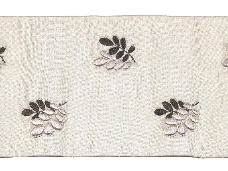 Ruban blanc, avec décor de bouquets de deux feuilles blanches et vertes en relief, parsemées