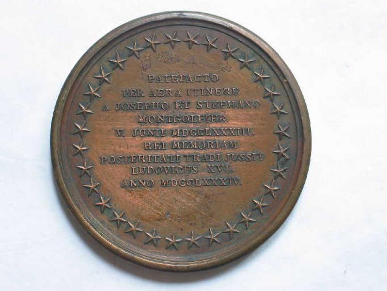légende, avers : AUDACIA FELIX. AERA PERMAERUNT XXI. NOV L. F. DARLANDES ET F. PILATRE. I. DEC. J.A.C. CHARLES ET M.N. ROBERT ANNO MDCCLXXXIII ; légende, revers : PATEFACTO PER AERA ITINERE A JOSEPHO ET STEPHANO MONTGOLFIER V. JUNII MDCCLXXXIII. REI MEMORIAM POSTERITATI TRADI JUSSIT LUDOVICUS XVI. ANNO MDCCLXXXIV