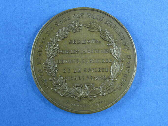 dédicace, avers : A EUGENE BUISSON Ier AOUT 1858 ... / SES COLLEGUES AESCHIMANN.ILLAIRE.PUYROCHE ET HOFFET TEMOIGNAGE D'AFFECTION FRATERNELLE ; légende, revers : SERMONS, POESIES PARABOLES, L'HOMME, LA FAMILLE ET LA SOCIETE SYNODE DE 1848/ VOTRE TRAVAIL NE SERA PAS VAIN AUPRES DU SEIGNEUR