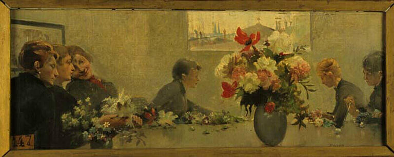 scène (femme, bouquet, table, fleur, tableau, discussion, assis)