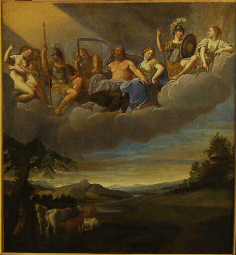 scène mythologique ; paysage (mythologie, Olympe, dieu gréco-romain, vache, nuage)