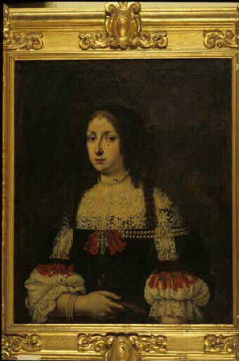 Portrait de jeune femme à mi-corps. Elle porte une coiffe noire, une robe brodée noire avec des rubans rouges et une grande collerette en dentelle blanche. Elle tient un éventail plié dans sa main droite.