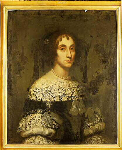portrait de femme à mi-corps, tournée vers la droite, portant une robe noire ornée de dentelle blanche.