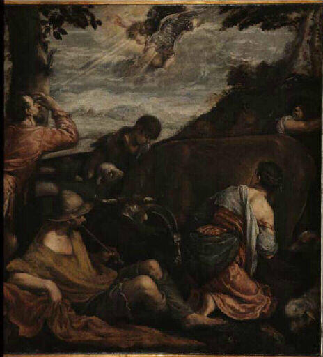scène biblique (ange, Annonce aux bergers, mouton, vache, berger, art de la musique, musicien, flûte à bec, chèvre)