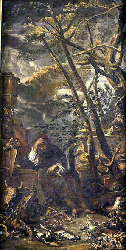 scène (Héraclite, philosophe, arbre, crâne : boeuf, mort, réflexion) ; fond de paysage (arbre, architecture)