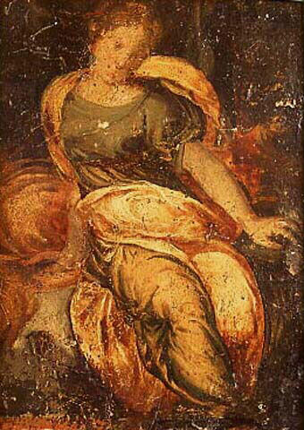 figure (femme, en pied, assis, draperie)
