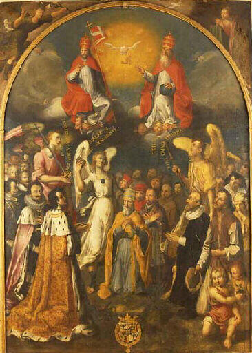 scène (Grégoire XIII, Este Philippe d', Charles-Emmanuel Ier le Grand, ordre de Saint-Maurice et Lazare, ordre et décoration savoyards, drapeau, ange, armoiries, ordre de l'Annonciade, noblesse, clergé, tiers état, pape, Savoie duc de, Trinité, Annonciation)